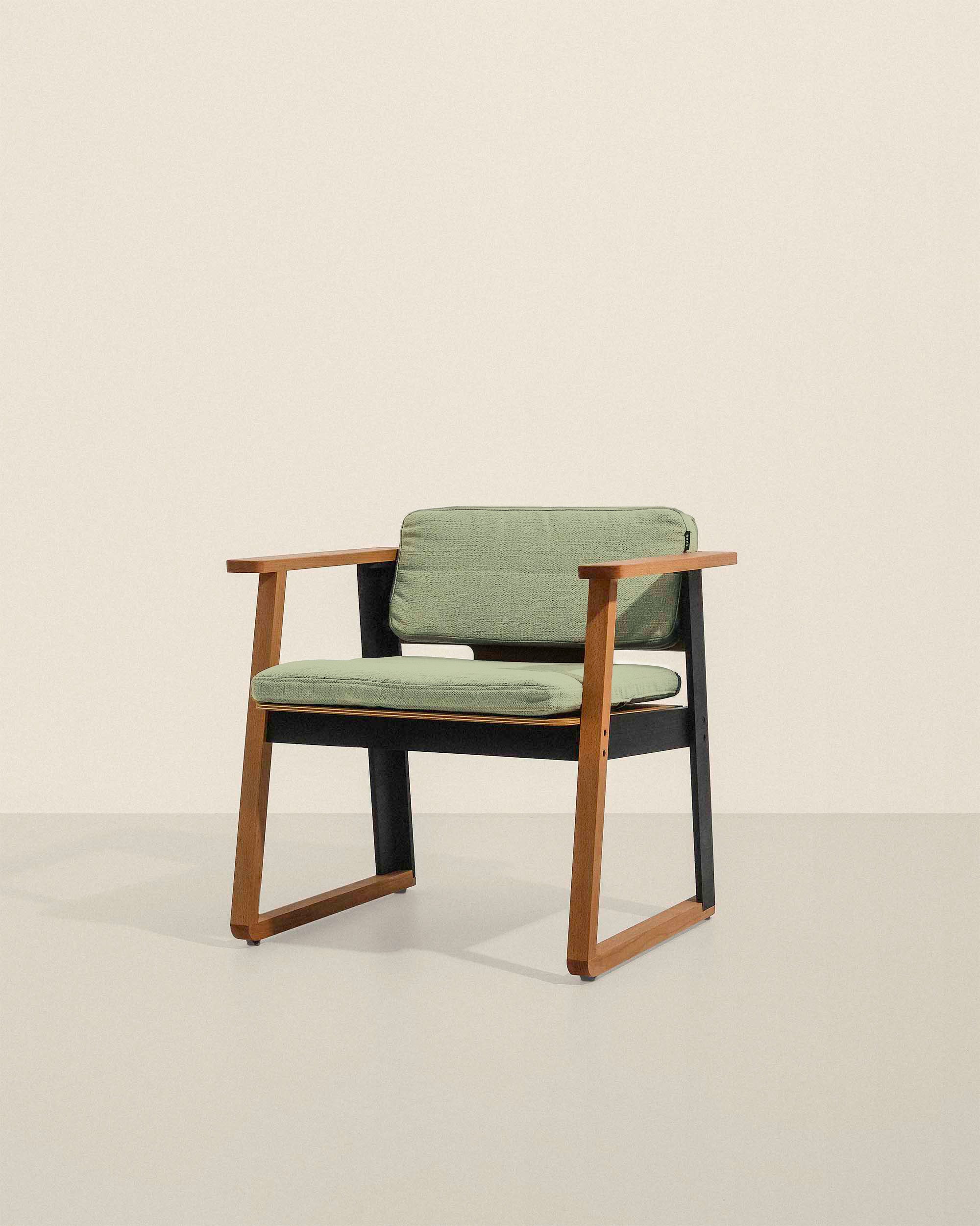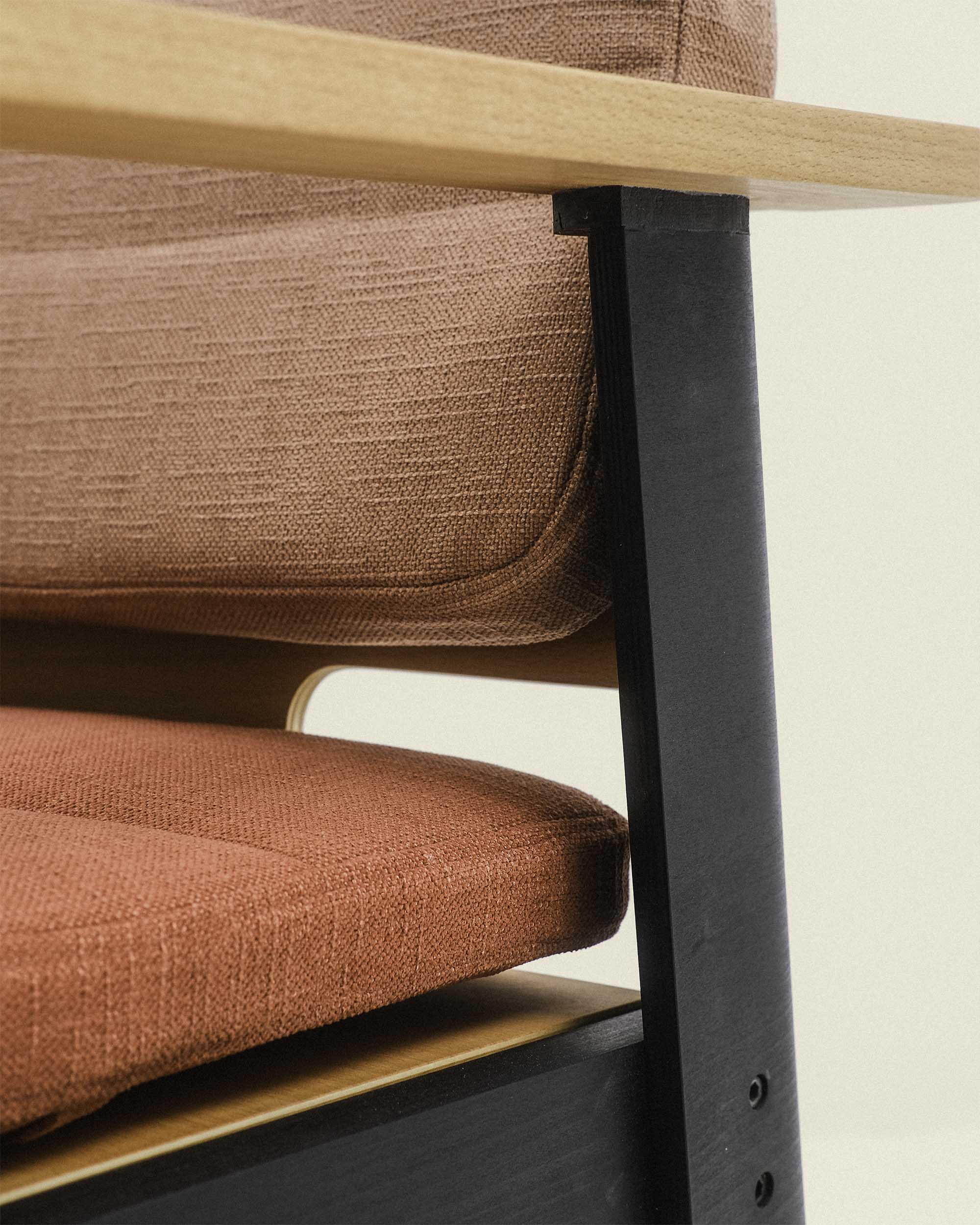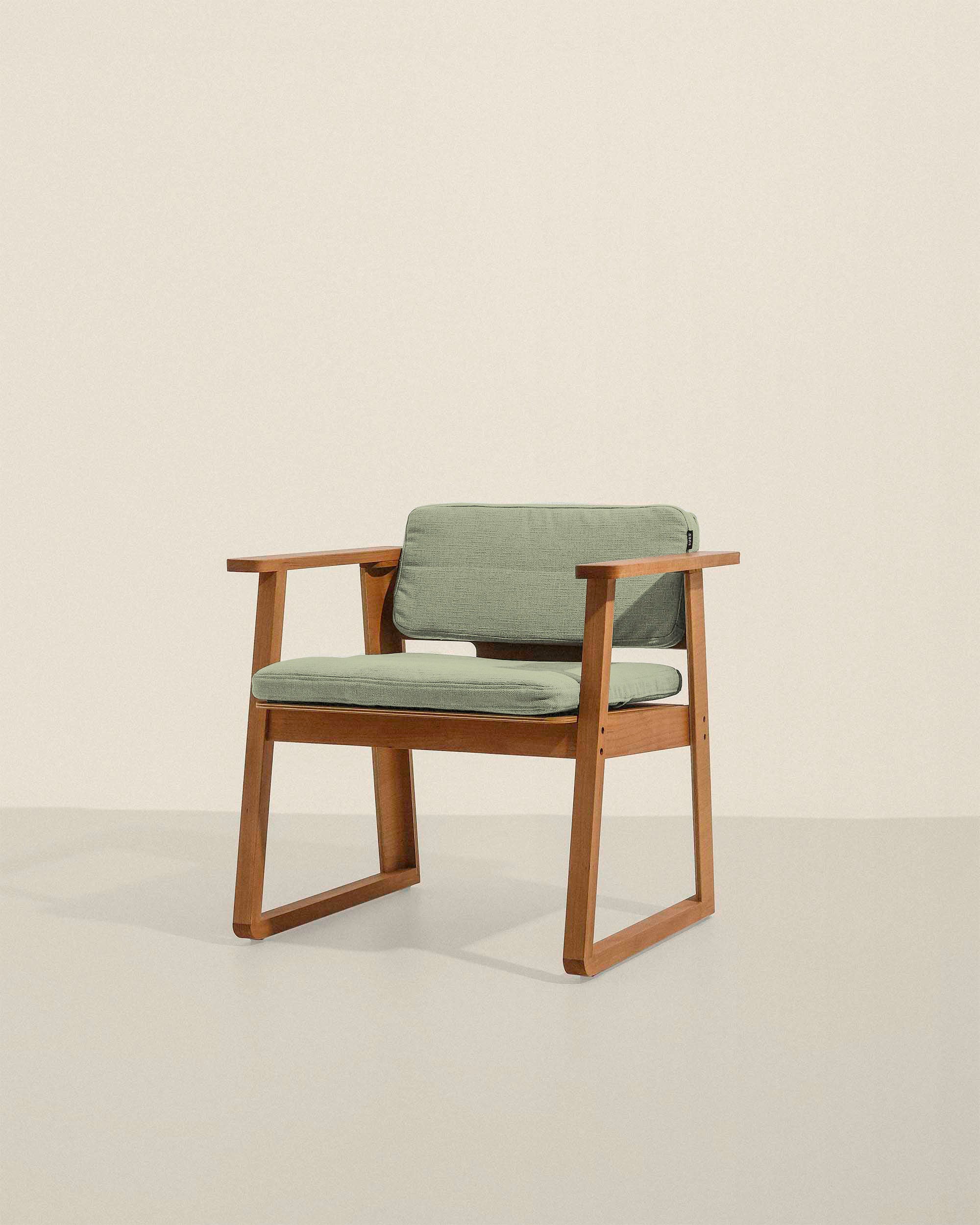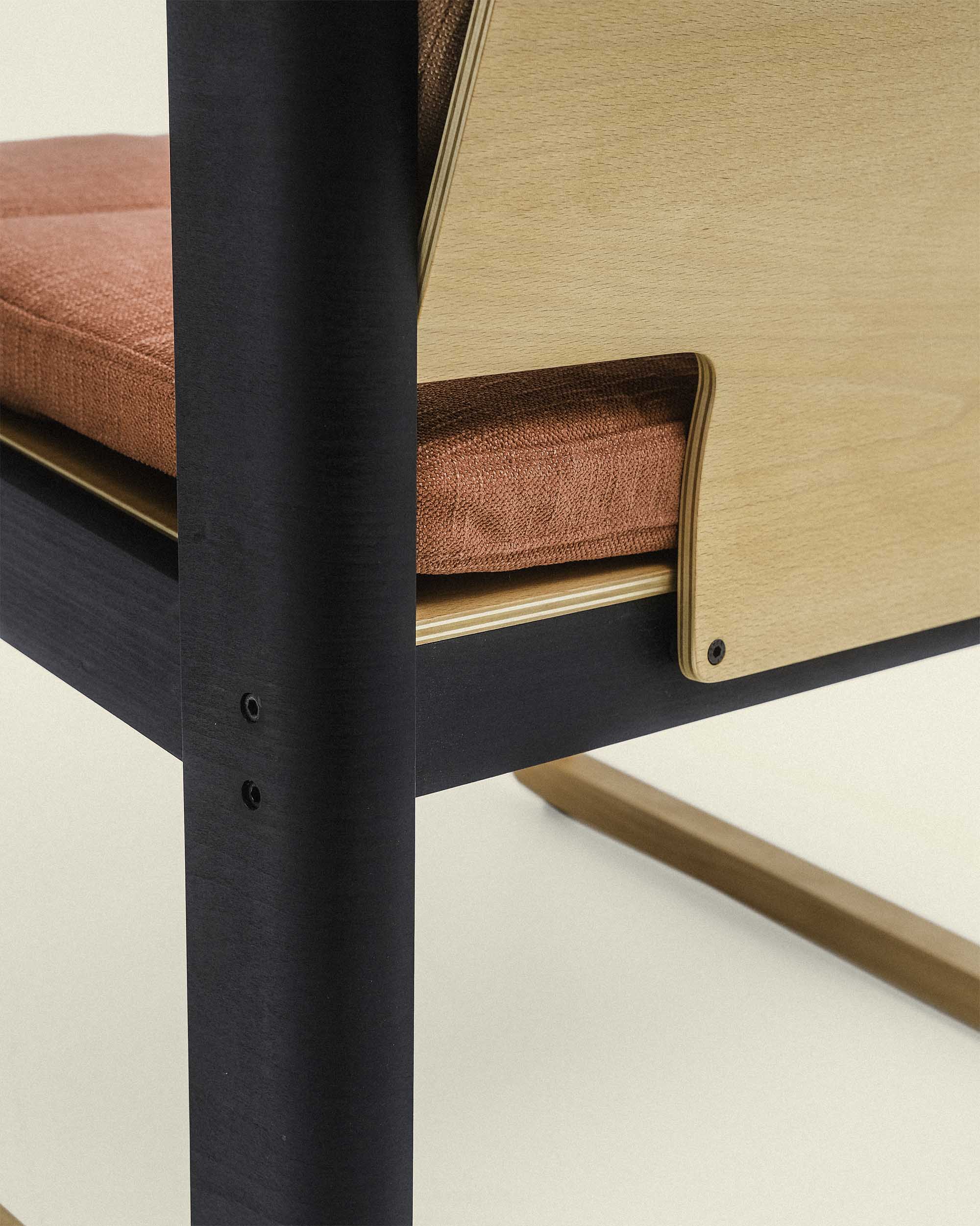 Armchair made from plywood and solid beech wood without added VOCs with FSC and PEFC certifications. Parts are coated with a a next-generation, VOC-free oil-wax that protects and colors wood in one coat. Coating doesn’t contain water or solvents. Cushions are made from rPET fabric, filled with repurposed sheep wool and are fully recyclable. Parts are assembled with screws.