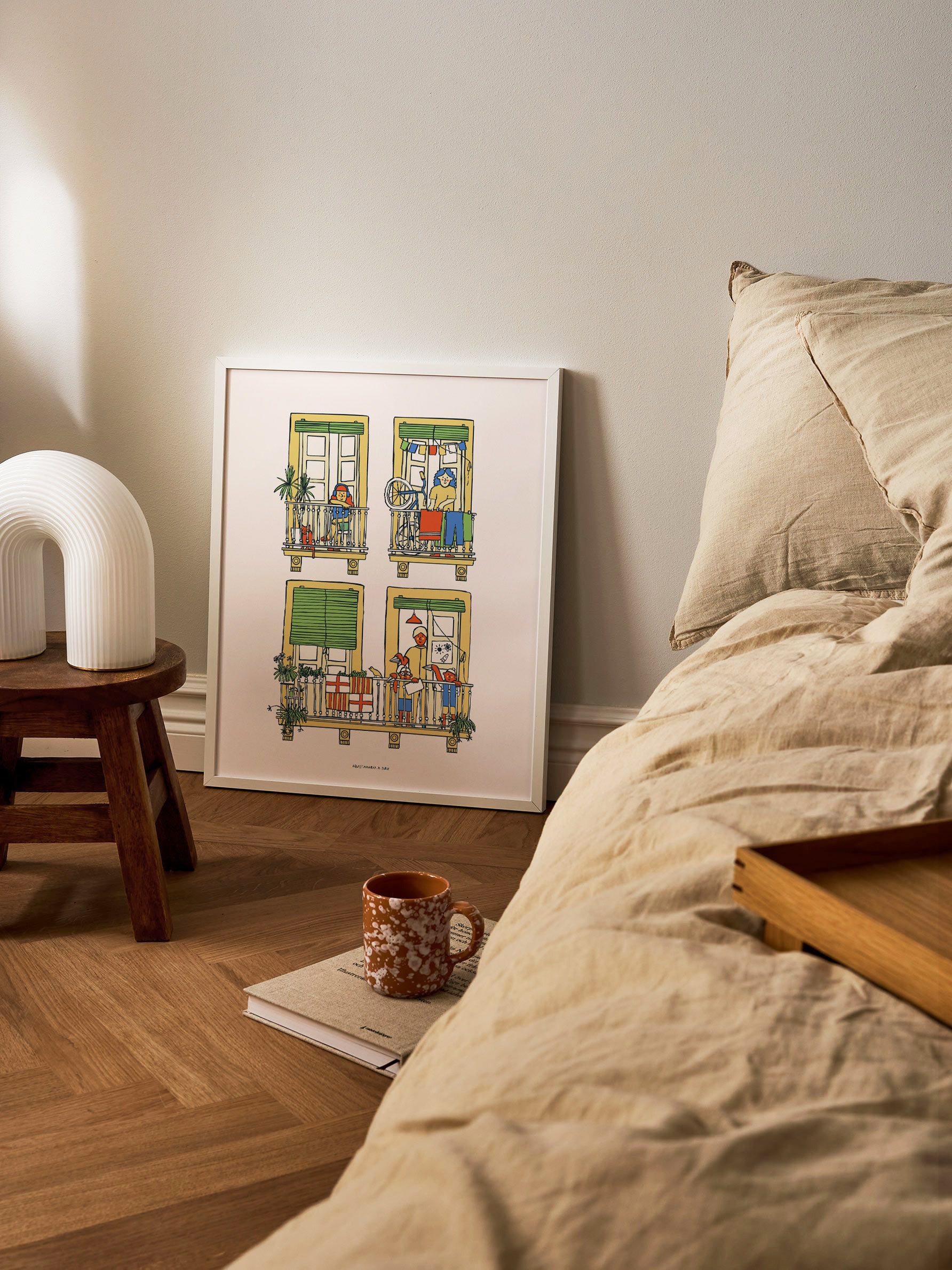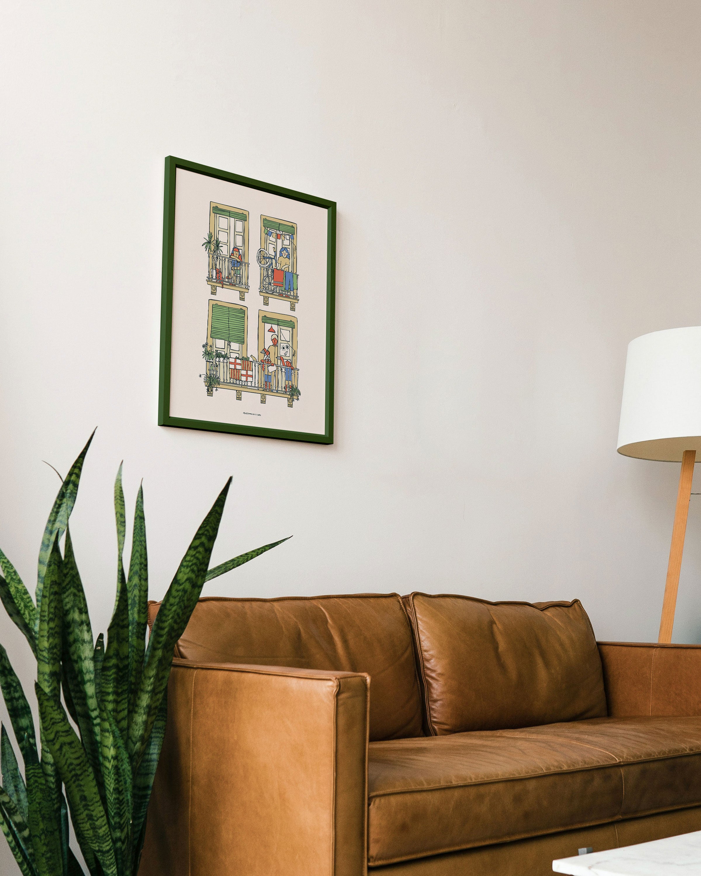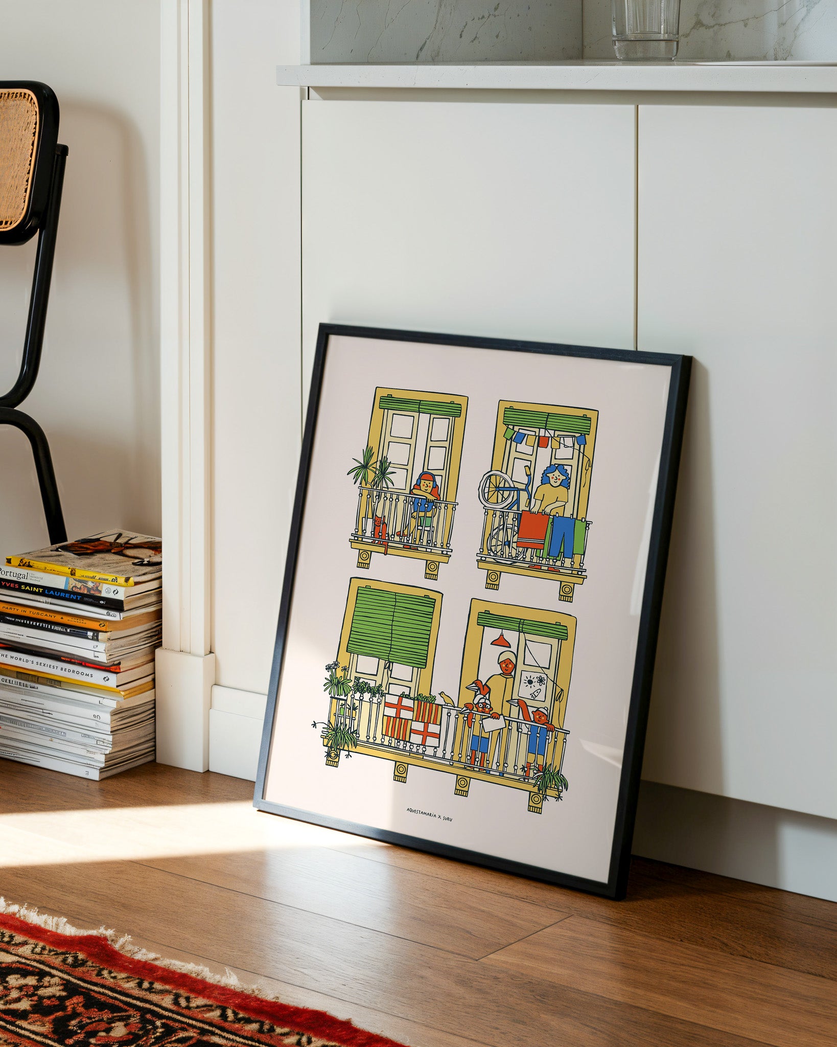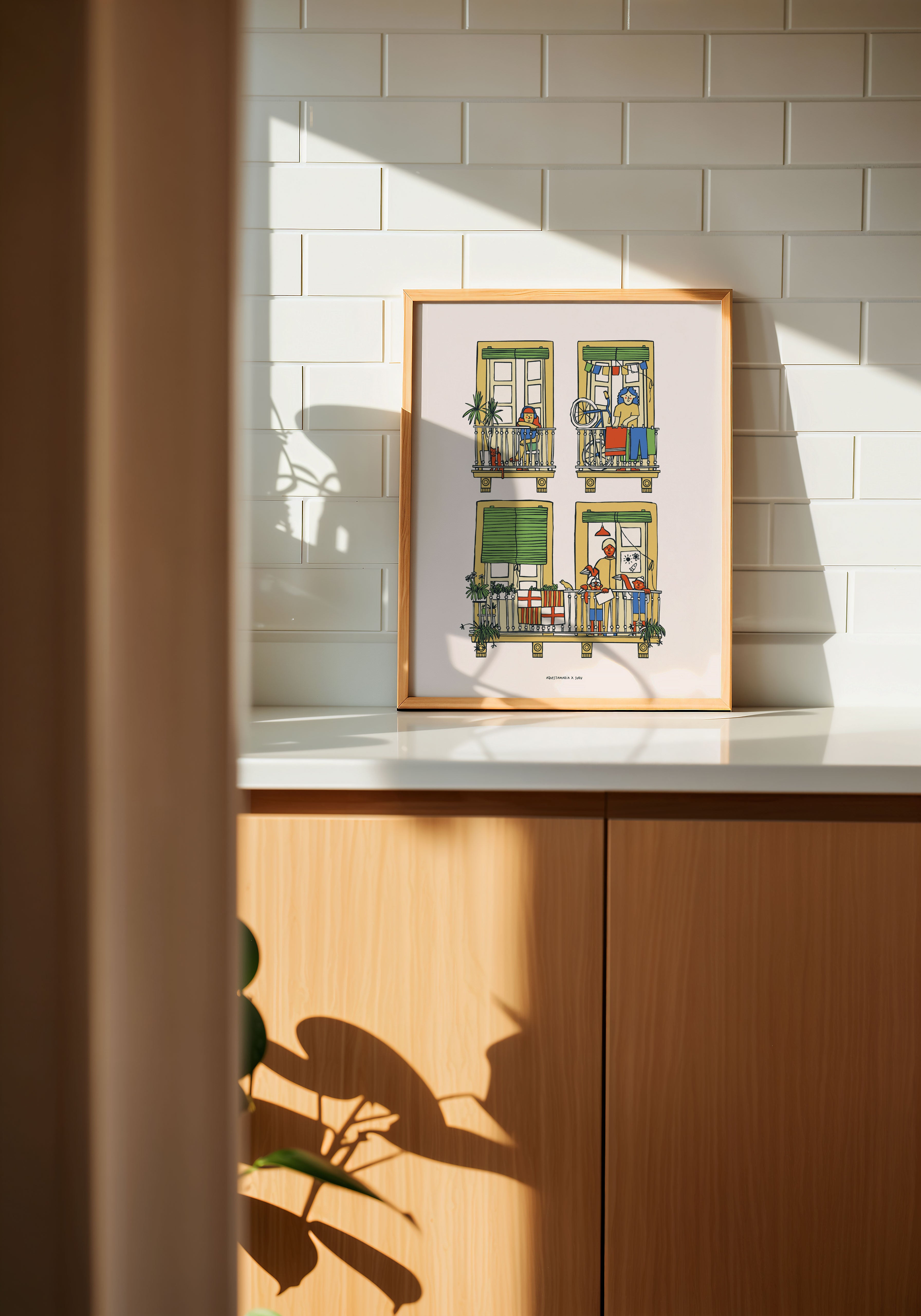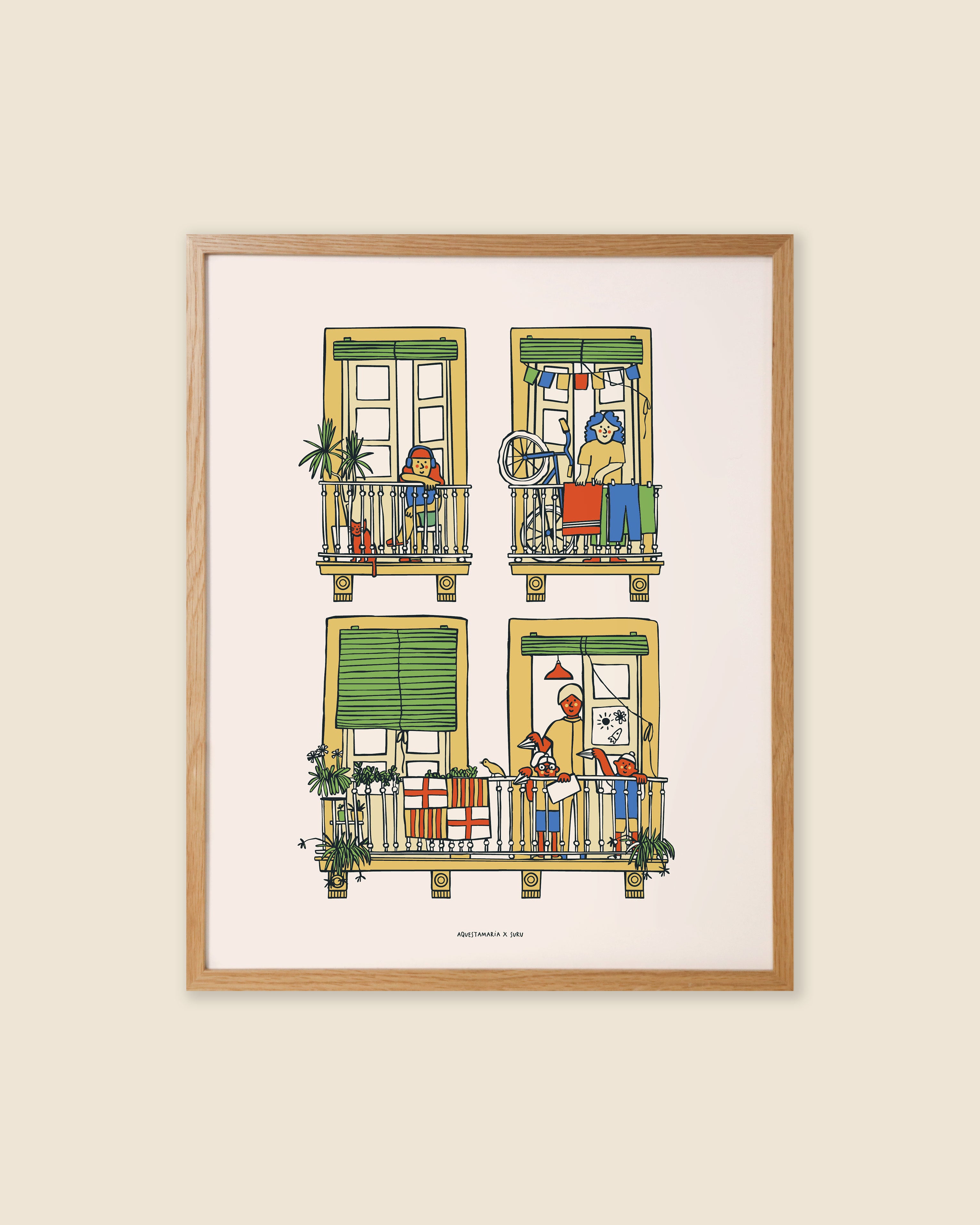Illustration that depicts a recognizable Barcelona sight: three balconies from three different homes, each with its own story, in the same moment in time.